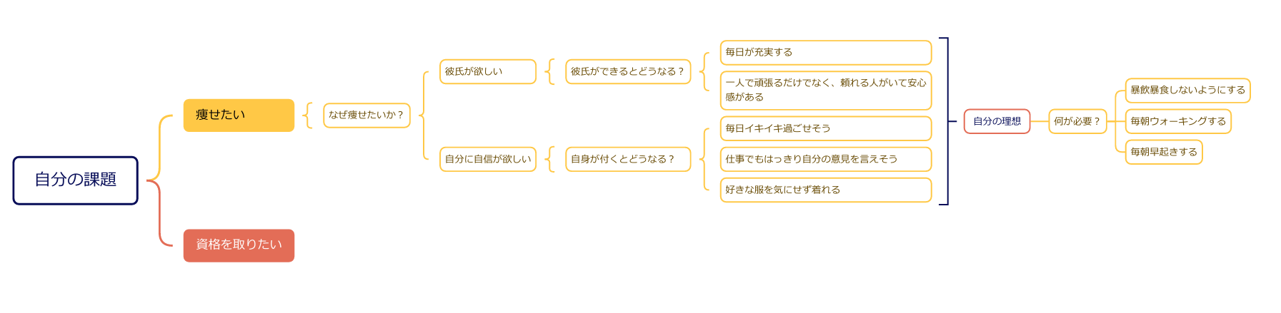 セッションでは、このようなマインドマップを使ってあなたの課題や理想を整理します。